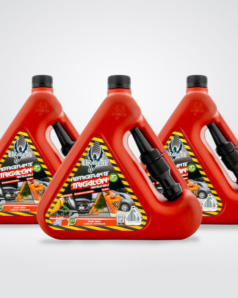 Envase con tres funciones, Refrigerante / Triángulo de Señalización / Bidón para líquidos en caso de emergencias en el camino.